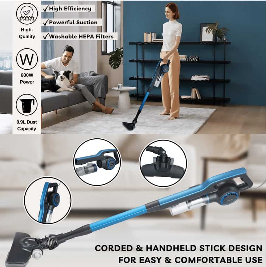 La conception filaire assure une puissance constante tout au long de votre session de nettoyage, garantissant un fonctionnement ininterrompu. Avec sa poignée confortable, vous pouvez manœuvrer facilement l’aspirateur et atteindre les espaces étroits en toute simplicité.