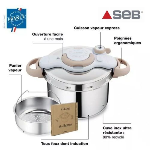 Cuisinez durable avec la SEB ClipsoMinut'® Eco-Respect. Une autocuiseur de 7,5L en acier inoxydable recyclé, conçue pour une cuisson rapide et saine. Système d'ouverture facile à une main et design beige élégant. Fabriquée en France.