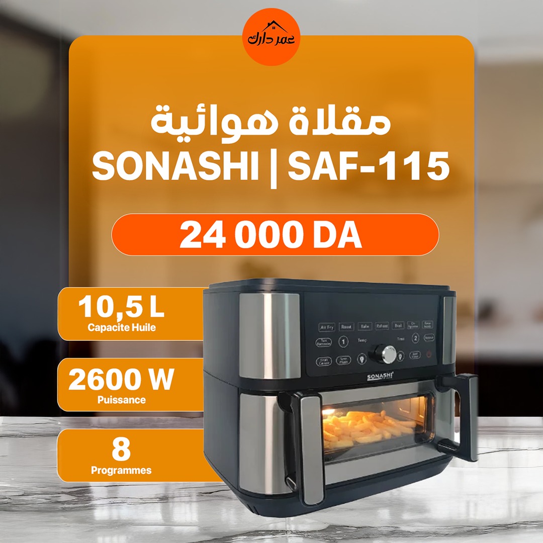 Pensée pour les familles nombreuses et les repas variés, la friteuse à air double bac SONASHI saf-115 vous permet de cuire deux plats à la fois, sans huile. Avec ses 8 programmes automatiques, son grand volume de 10,5L et sa puissance de 2600W, elle assure une cuisson rapide, saine et homogène.
